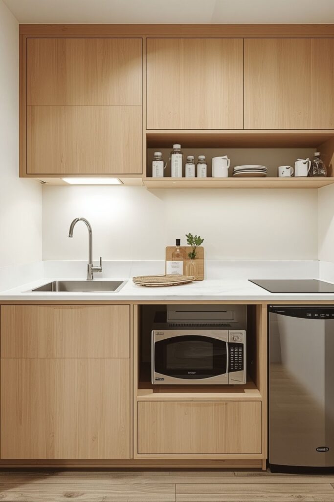The key is to keep surfaces clear. When counters stay uncluttered, the kitchen looks larger and easier to use. Light tones, hidden storage, and slim open shelves enhance the simplicity. This design supports everyday cooking without crowding the room.