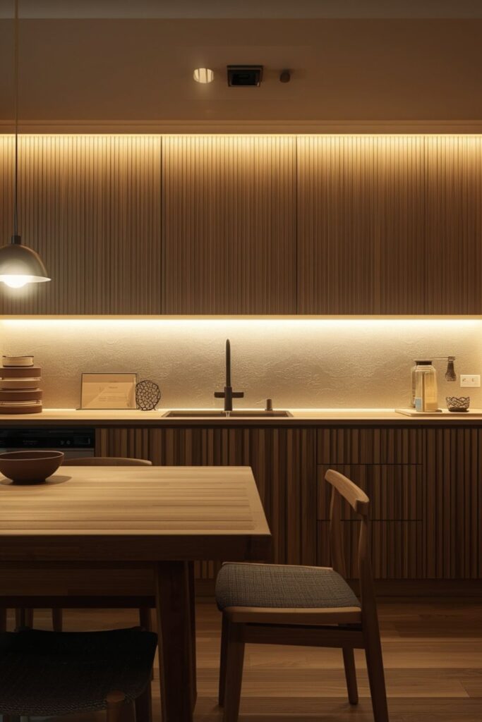 Lighting is one of the most overlooked elements in Japanese kitchens. Warm lighting makes a huge difference in creating a peaceful cooking environment. Soft overhead LEDs, under-cabinet strips, and minimalist pendant lights create clarity without harsh brightness.