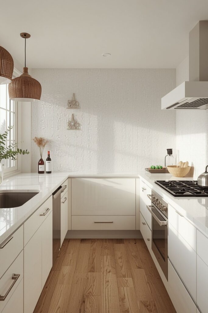 Textured ceramic tiles add depth while remaining easy to clean and maintain. Tiles with soft matte surfaces, uneven edges, or handmade variations create a relaxed, natural feel in modern white kitchens. Ceramic texture looks especially attractive behind the stove or on a backsplash because light highlights the tile pattern without overwhelming the space.