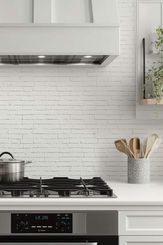 White brick walls are popular in textured white kitchen wall ideas because they bring a blend of rustic comfort and contemporary style. Instead of adding strong baking colors or complicated designs, white brick creates natural lines and textured depth. It looks especially good with wooden shelves, black fixtures, and matte countertops in modern spaces.