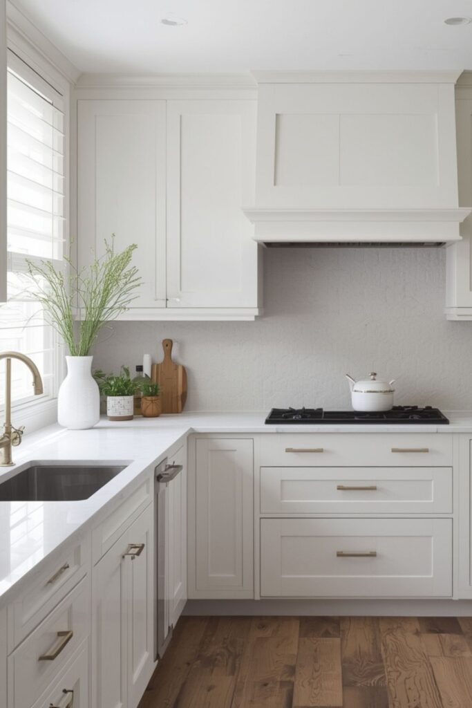 Plaster walls have a soft, handmade look that instantly warms up a white kitchen. A plaster surface introduces subtle curves and uneven strokes that catch natural light throughout the day. This type of simplicity brings character into the kitchen without relying on bold patterns or color contrast. Plaster works well behind open shelves or near windows where texture remains visible.