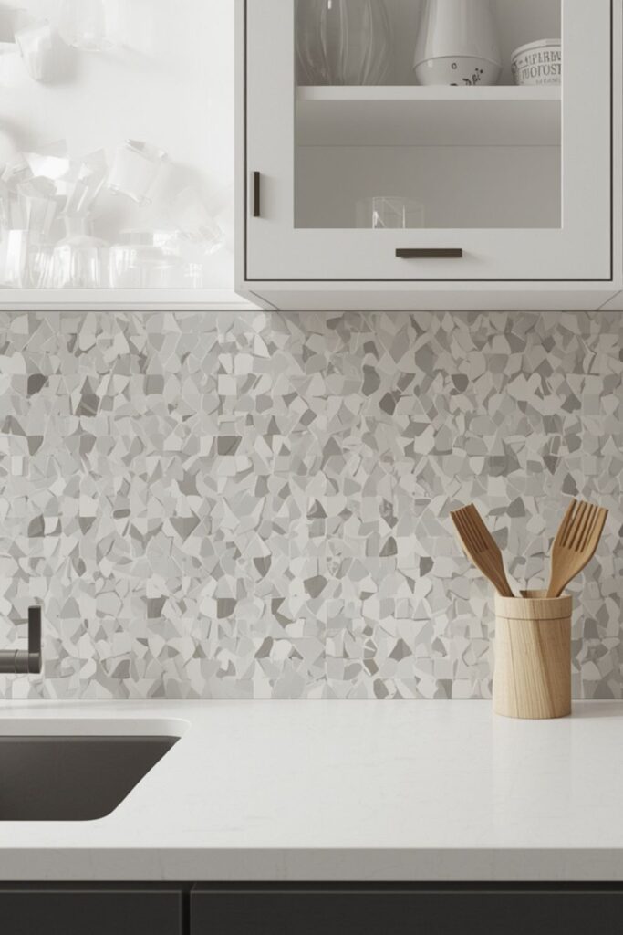 Mosaic tile allows for gentle pattern without overpowering a minimalist kitchen. Small tiles, handmade shapes, or uneven edges add dynamic visual flow. These surfaces reflect light in soft gradients and give walls a beautiful handcrafted feel. Mosaic designs often appear in Textured White Kitchen Wall Ideas because they add personality quietly.