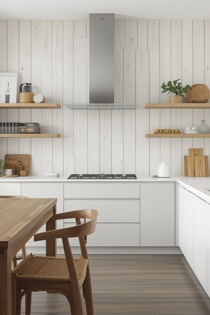 Whitewashed wood is a comfortable way to bring organic texture into modern kitchens. The natural grain remains visible through the white finish, delivering warmth while still keeping the kitchen visually simple. White wood panels look peaceful and pair well with minimal furniture and soft lighting.